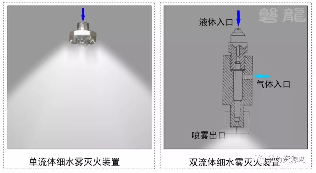 1、按流動(dòng)介質(zhì)類(lèi)型分類(lèi),細水霧滅火裝置可以分為單流體細水霧滅火裝置和雙流體細水霧滅火裝置。